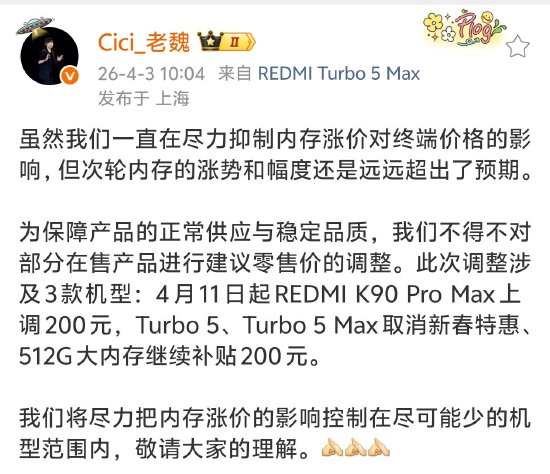小米调整三款REDMI手机售价,高管回应:内存涨势和幅度远远超出预期
